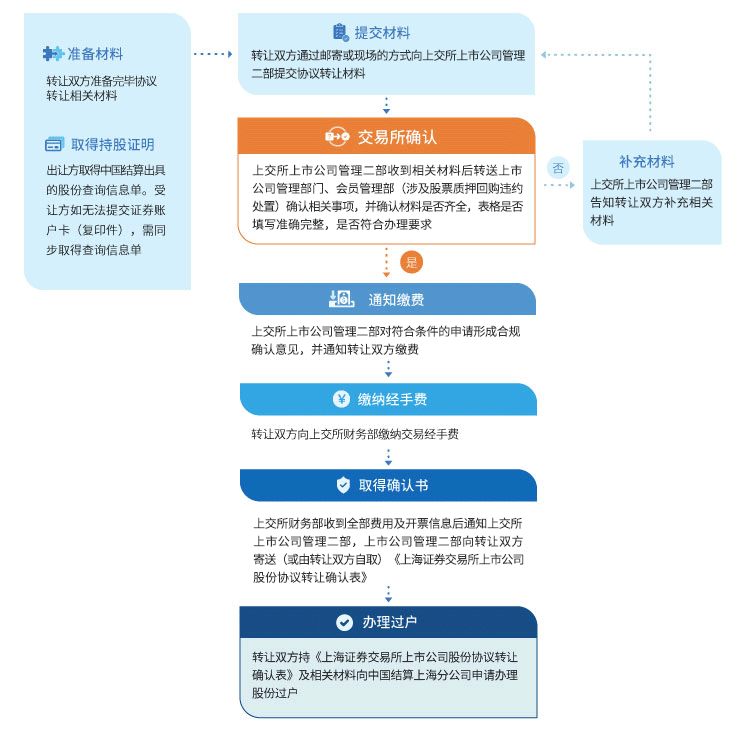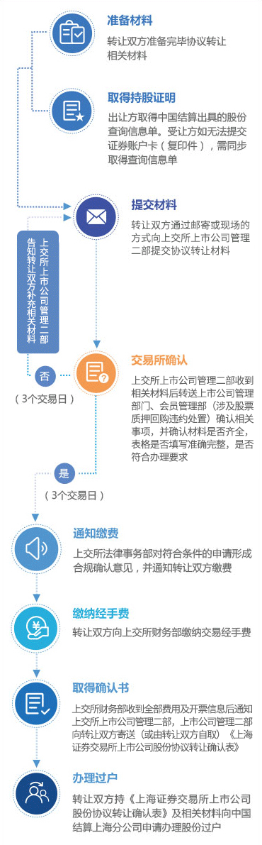 本所依據(jù)《上市公司非流通股股份轉(zhuǎn)讓業(yè)務(wù)辦理規(guī)則》《上市公司非流通股股份轉(zhuǎn)讓業(yè)務(wù)辦理實(shí)施細(xì)則》《上市公司流通股協(xié)議轉(zhuǎn)讓業(yè)務(wù)辦理暫行規(guī)則》及《上海證券交易所上市公司股份協(xié)議轉(zhuǎn)讓業(yè)務(wù)辦理指引》等規(guī)定受理協(xié)議轉(zhuǎn)讓申請,對轉(zhuǎn)讓雙方提交的申請文件進(jìn)行完備性核對,并對符合條件的協(xié)議轉(zhuǎn)讓出具合規(guī)確認(rèn)意見。轉(zhuǎn)讓雙方持合規(guī)確認(rèn)意見,前往中國證券登記結(jié)算有限責(zé)任公司辦理股份過戶手續(xù)。